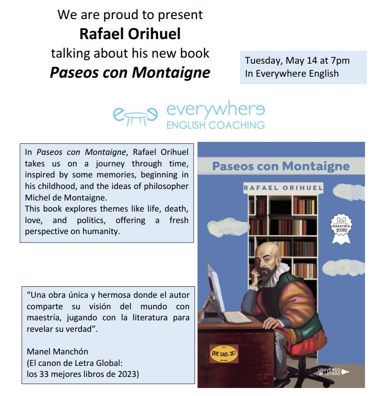 < NoticiasEl próximo martes día 14 de Mayo a las 7 de la tarde el autor Rafael Orihuel presentará su nuevo libro Paseos con Montaigne. La presentación se hará en inglés en Everywhere English.